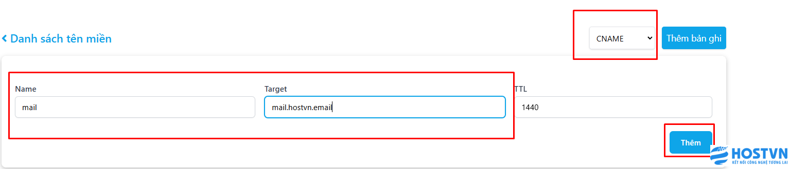 4. Tiếp tục tạo bản ghi CNAME ( ở bước này bạn chỉ cần thêm 1 bản ghi như dưới là dịch vụ có thể hoạt động bình thường ).