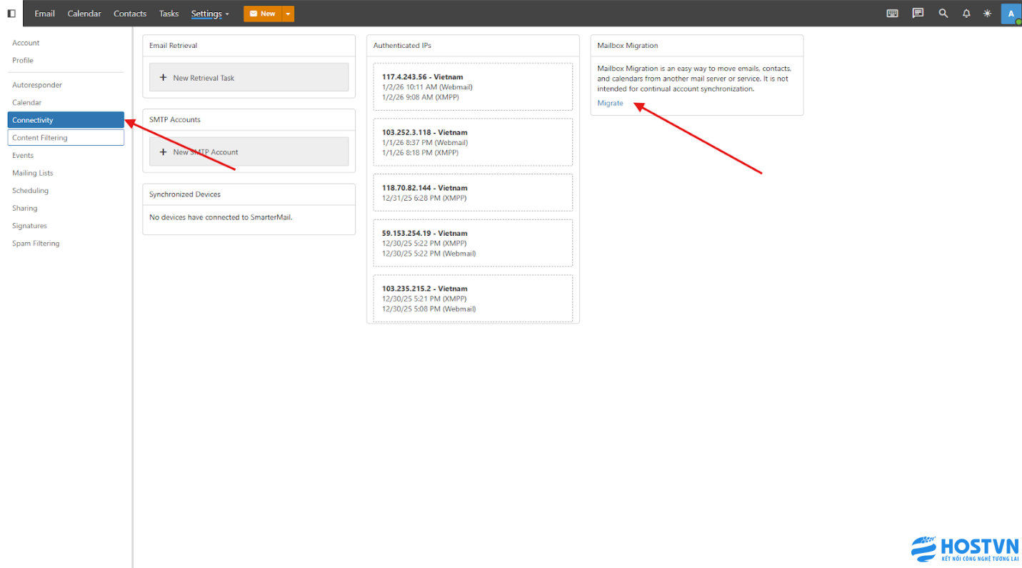 Bước 2: Chọn Connectivity => Mailbox Migration => Migrate.