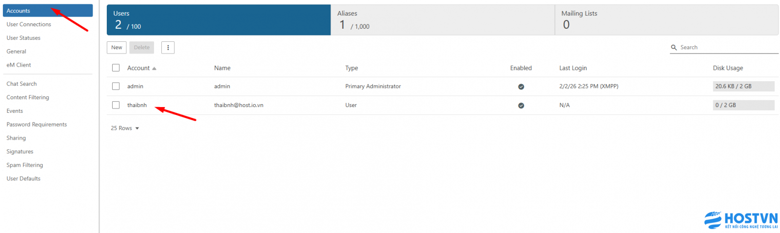 Tại menu quản lý, bạn tìm đến phần Domain Settings -> chọn mục Accounts.
