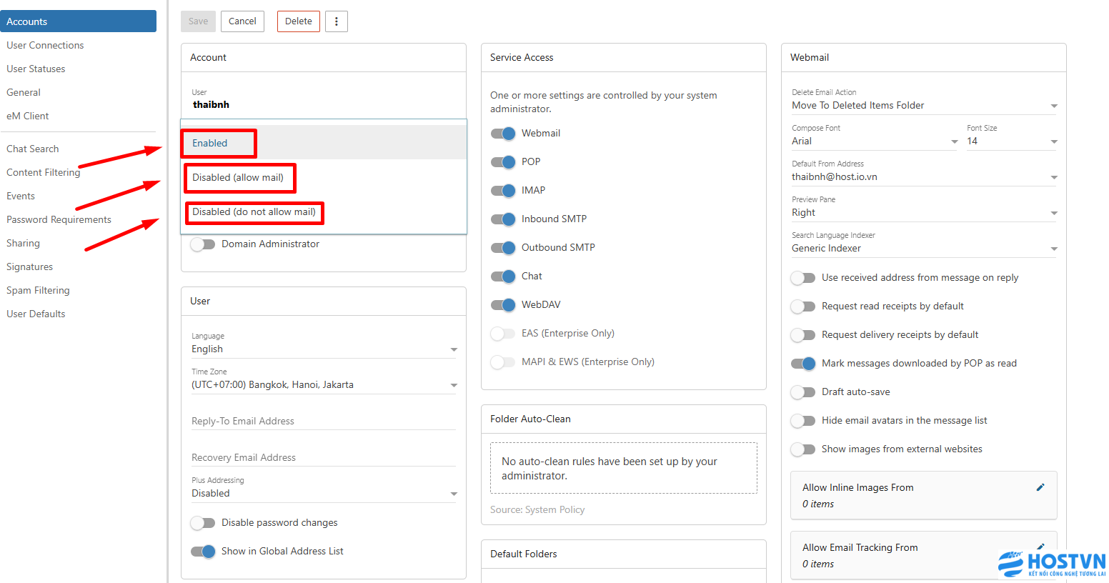 Enable: Tài khoản hoạt động bình thường (có thể đăng nhập, gửi và nhận mail).