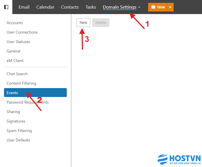 Đầu tiên, bạn cần truy cập vào tài khoản email có quyền cao nhất, chọn đến Domain Settings và chọn Events và New để tiến hành thiết lập.