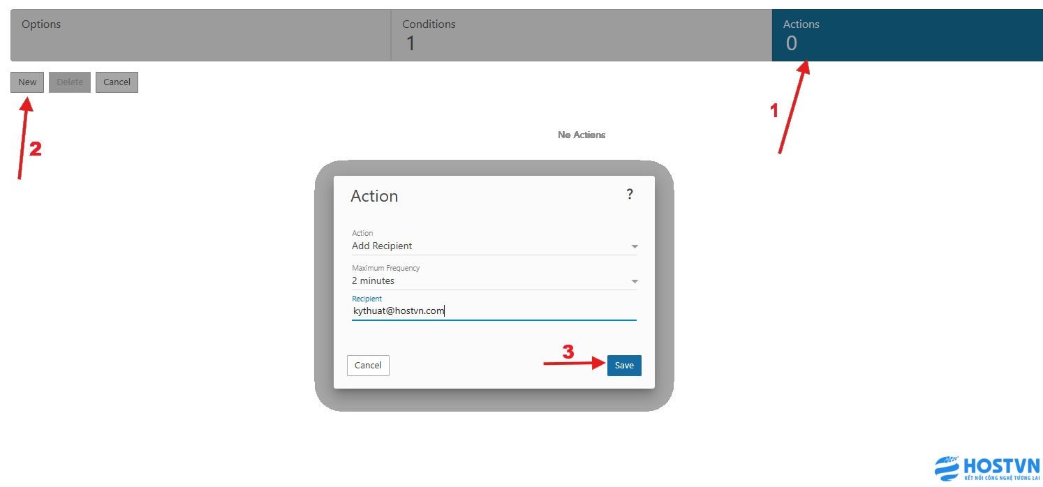 Sau đó, chuyển sang Action > News và để action là Add Recipient để thêm tài khoản người nhận, sau đó nhấn Save để hoàn tất.