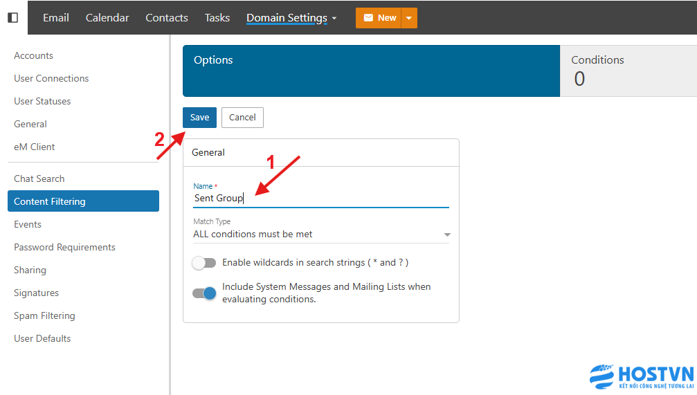 Tiếp theo, tạo Condition (Điều kiện) thứ 2 với nội dung địa chỉ group, ví dụ group all@hostvn.com.