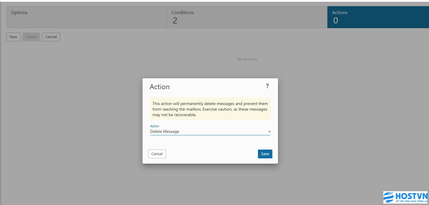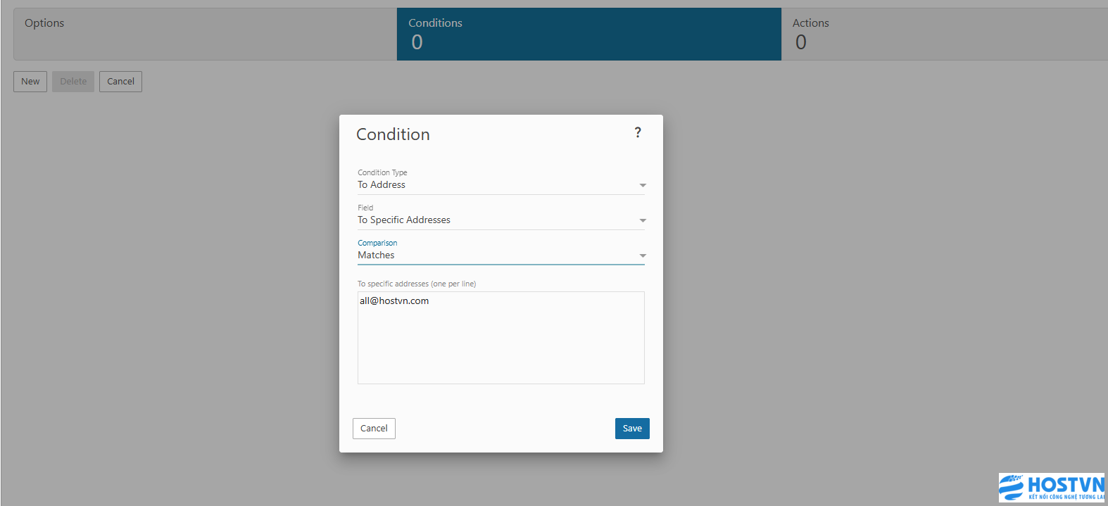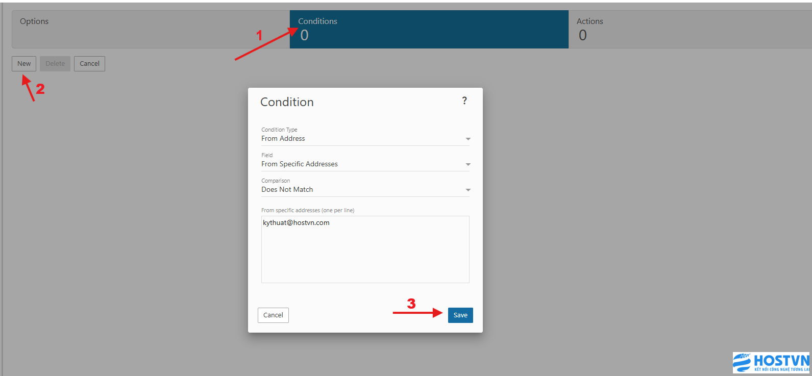 Sau đó, chuyển sang Condition (Điều kiện) và thiết lập như các ảnh dưới đây, đầu tiên là điều kiện người gửi, thêm email có quyền gửi đến bằng tài khoản mà bạn chỉ định, ví dụ kythuat@hostvn.com.