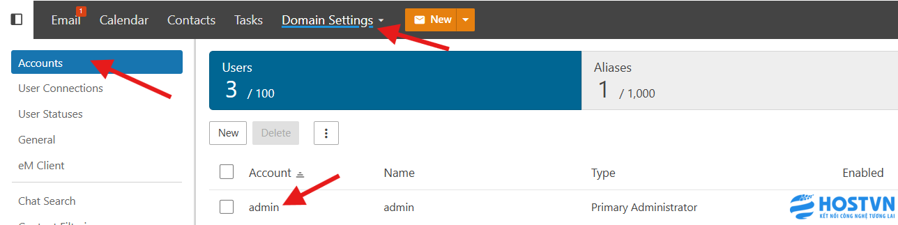 Đầu tiên, bạn truy cập vào webmail với tài khoản có quyền quản trị cao nhất, tìm đến Domain Settings, chọn đến Account mà bạn cần giới hạn.