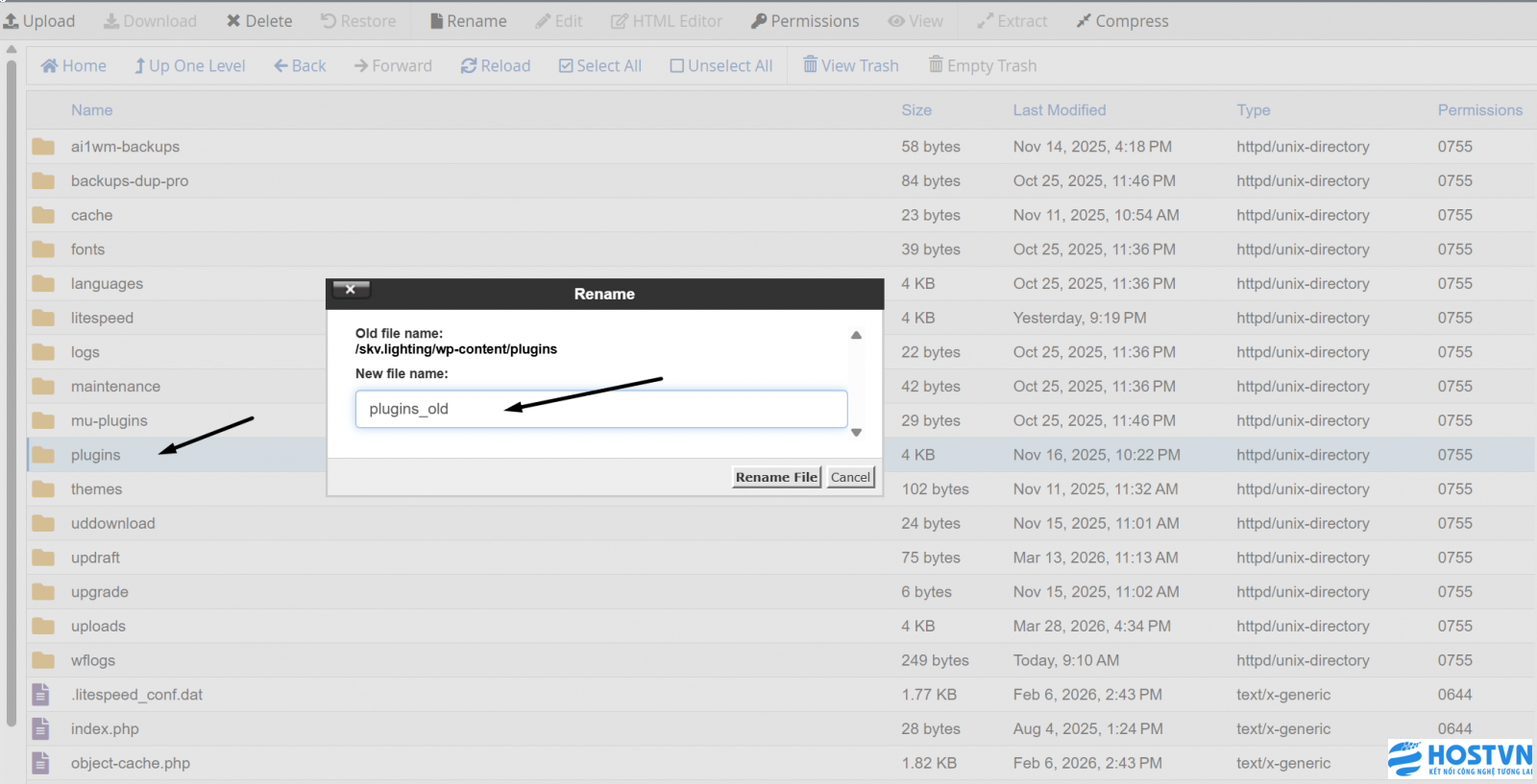 Nếu KHÔNG vào được Admin: Sử dụng FTP hoặc Bộ quản lý tệp trong cPanel, tìm đến thư mục /wp-content.