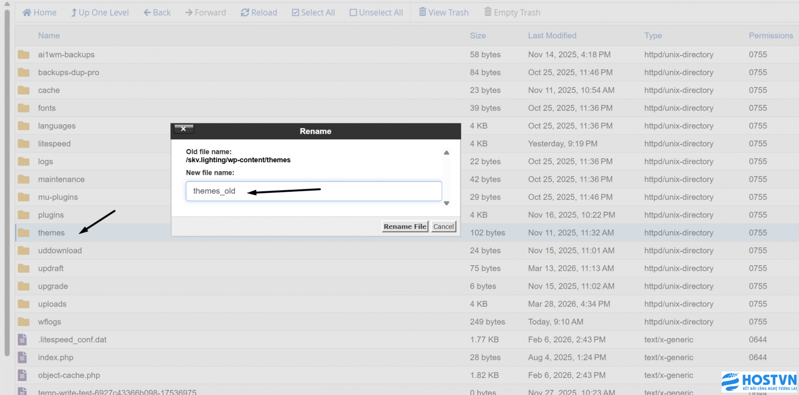 Thực hiện tương tự với thư mục themes. WordPress sẽ tự động quay về giao diện mặc định..