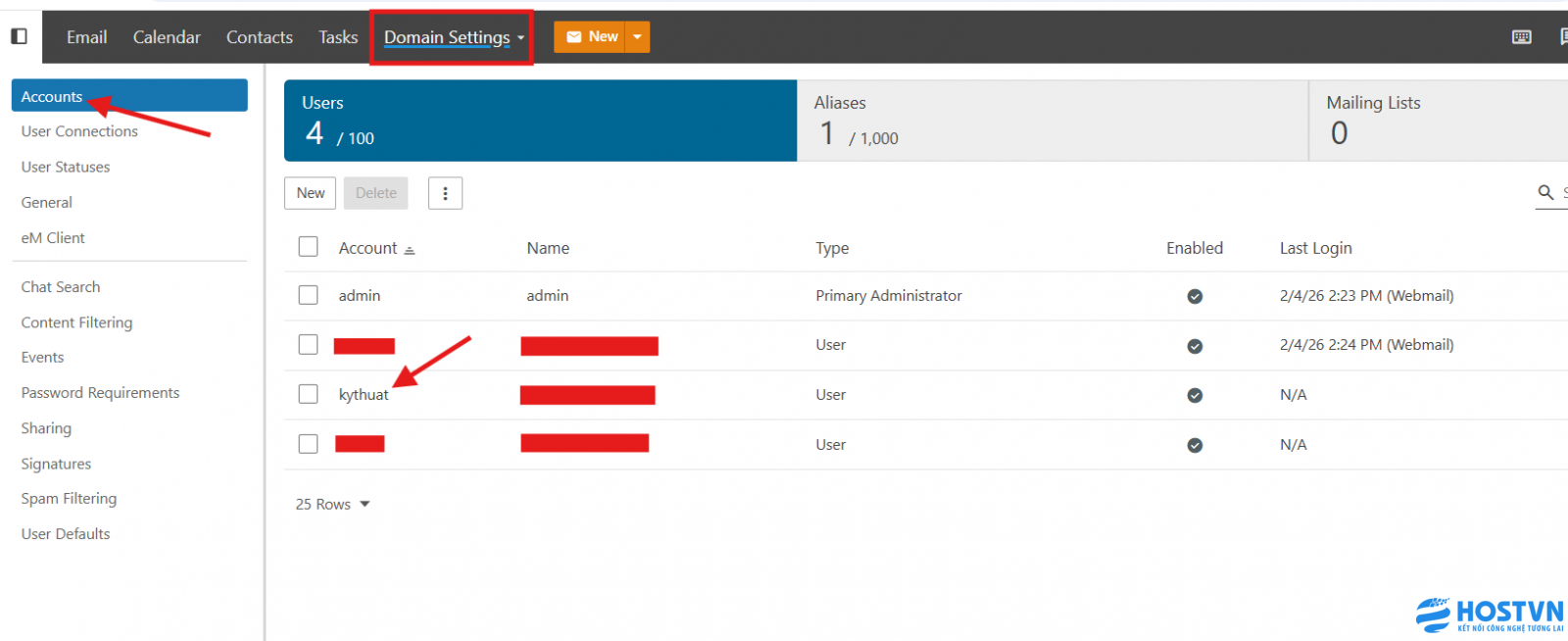 Tiếp theo, bạn chọn đến Domain Settings và tìm đến Accounts và chọn vào tài khoản bạn muốn thiết lập.