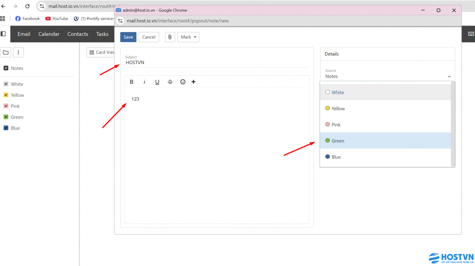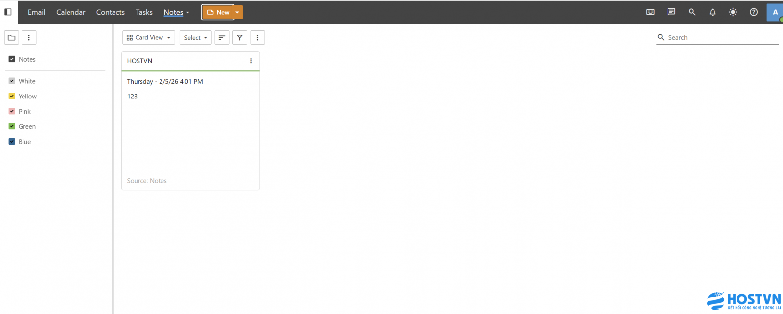 Mô tả: Chức năng Notes cho phép người dùng tạo, lưu trữ và quản lý các ghi chú cá nhân hoặc công việc trực tiếp trên giao diện Webmail. Đây là công cụ hữu ích để lưu lại các thông tin quan trọng một cách nhanh chóng.