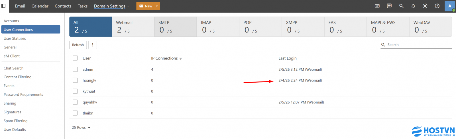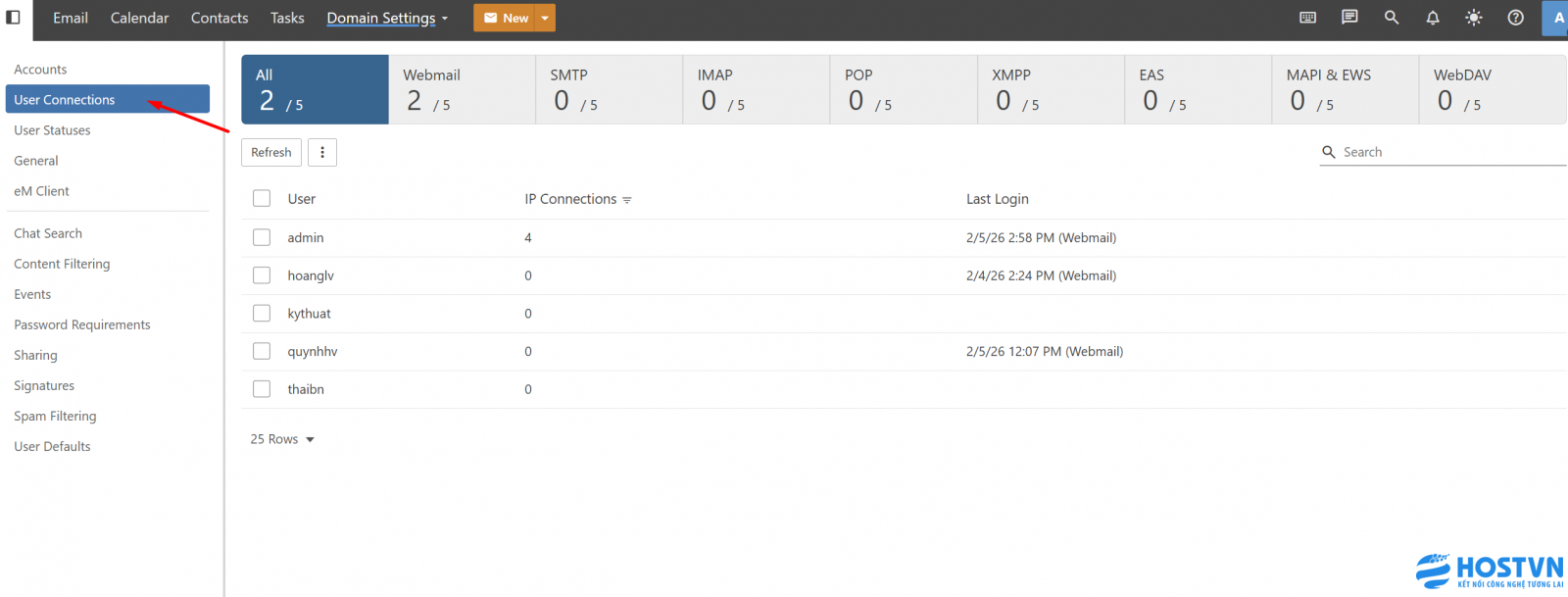 Mô tả: Chức năng User Connections là công cụ giúp quản trị viên giám sát toàn bộ các kết nối đang hoạt động trong hệ thống Email Business theo thời gian thực. Điều này giúp bạn kiểm soát bảo mật và theo dõi tình trạng sử dụng của các tài khoản thành viên.