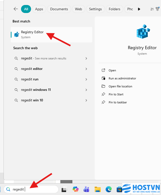 Tại thanh tìm kiếm trên Windows, bạn tìm kiếm regedit và chọn vào Registry Editor.
