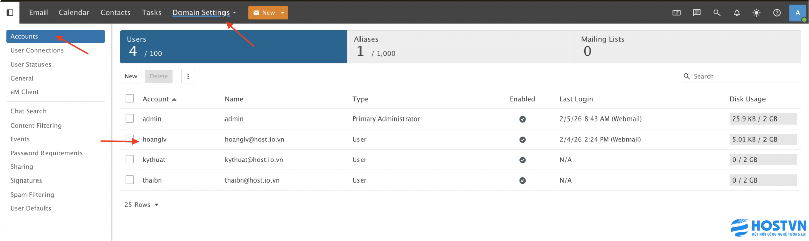 Bước 1: Đăng nhập vào webmail của bạn bằng tài khoản quản trị viên và nhấn chọn More > Domain Settings, tại mục Accounts chọn User cần điều chỉnh.