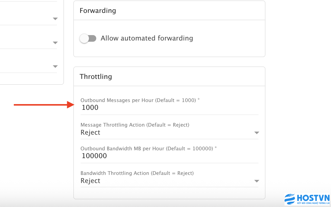 Bước 2: Tìm đến mục Throttling --> Outbound messages per Hour.. Bạn thay đổi thông số ở đây sau đó nhấn Save để áp dụng cho user.