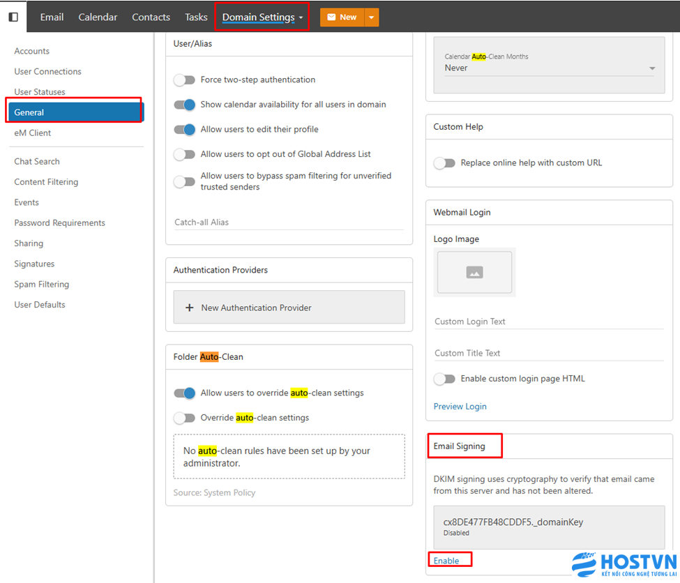 Đăng nhập vào email bằng tài khoản quản trị (Admin) và chọn mục Domain Settings (Cài đặt cho tên miền) -> General (Cài đặt chung) -> Email Signing (Ký kết email (Cần thiết)) -> Enable (Bật)