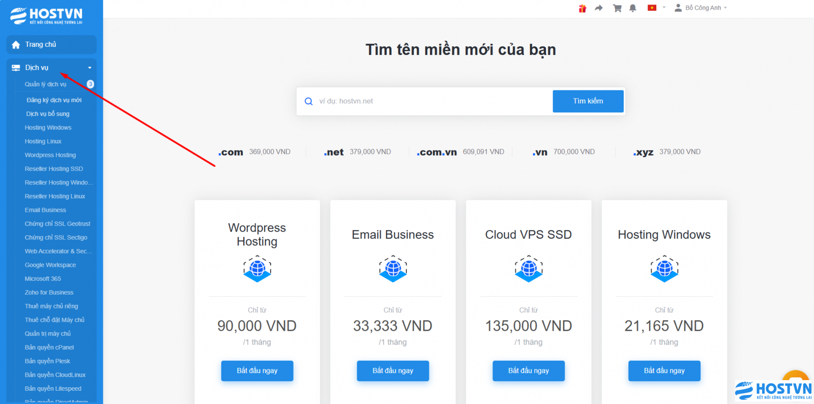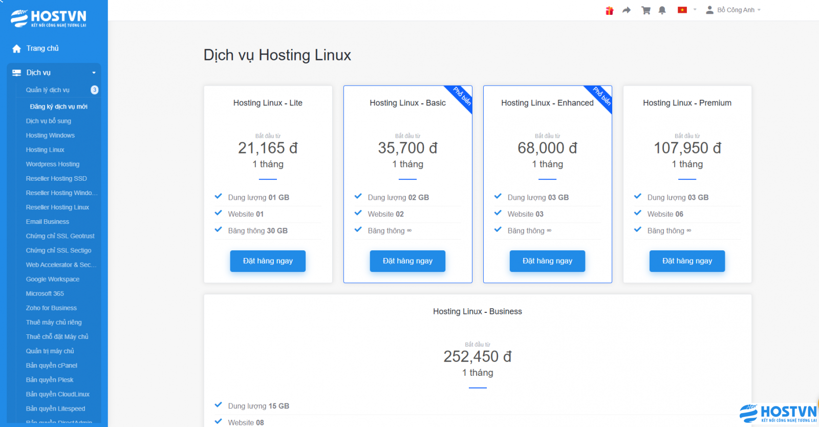 Để có đơn hàng dịch vụ WEB HOSTING như mong muốn, ngoài việc yêu cầu nhân viên Kinh doanh hỗ trợ tạo đơn hàng, bạn vẫn có thể chủ động tạo đơn hàng theo nhu cầu của mình. Bạn đăng nhập vào đường dẫn vào tài khoản khách hàng https://manage.hostvn.net/clientarea.php và chọn ĐĂNG KÝ DỊCH VỤ MỚI -> WEB HOSTING Trường hợp bạn chưa có tại khoản manage.hostvn.net bạn có thể làm theo hướng dẫn sau: Hướng dẫn tạo tài khoản khách hàng Bước 2: Chọn gói dịch vụ cần đăng ký mới.
