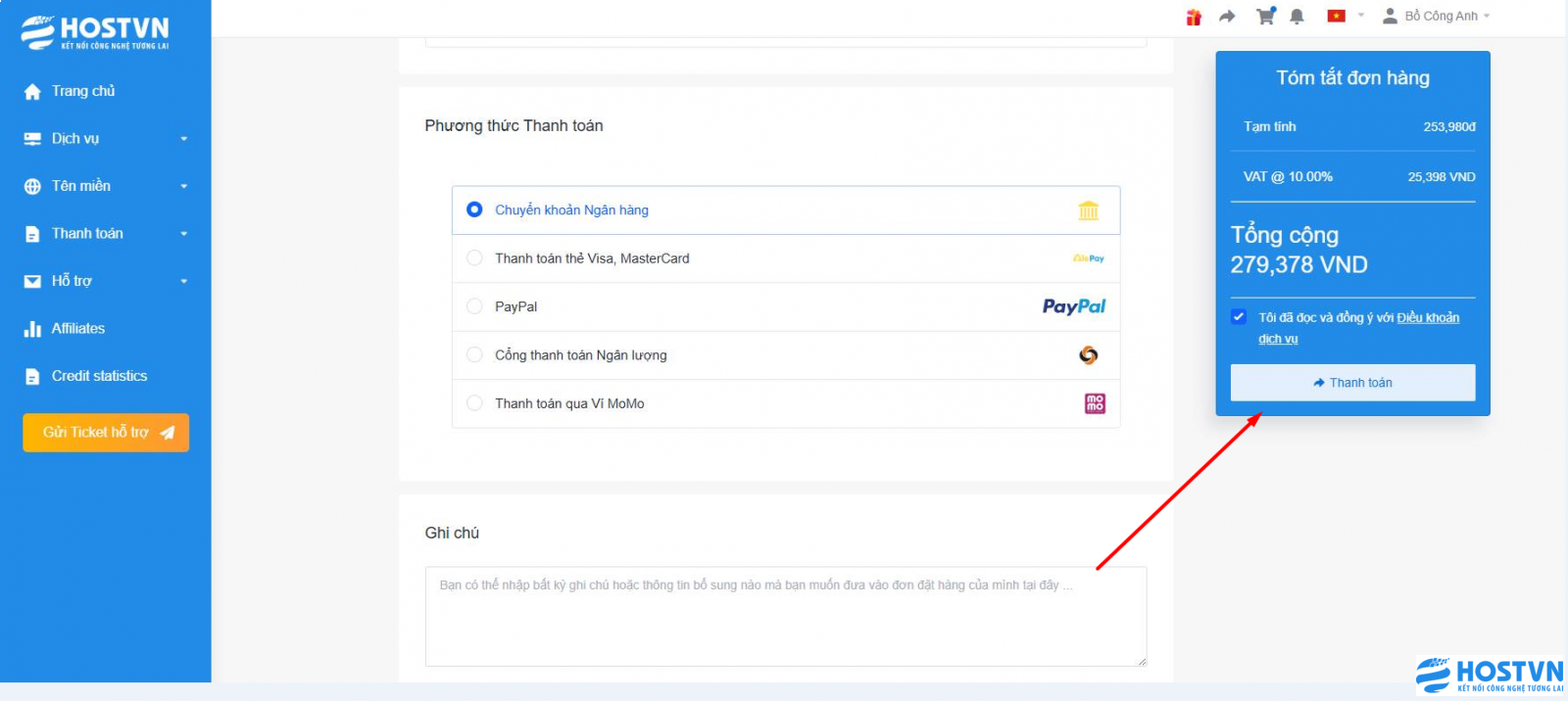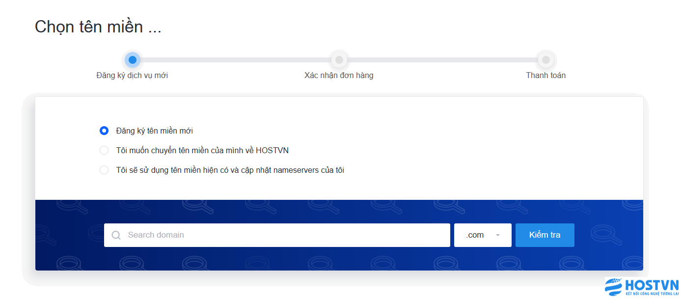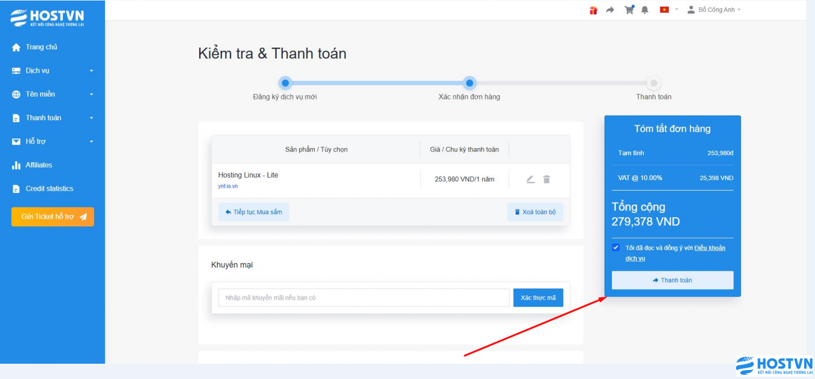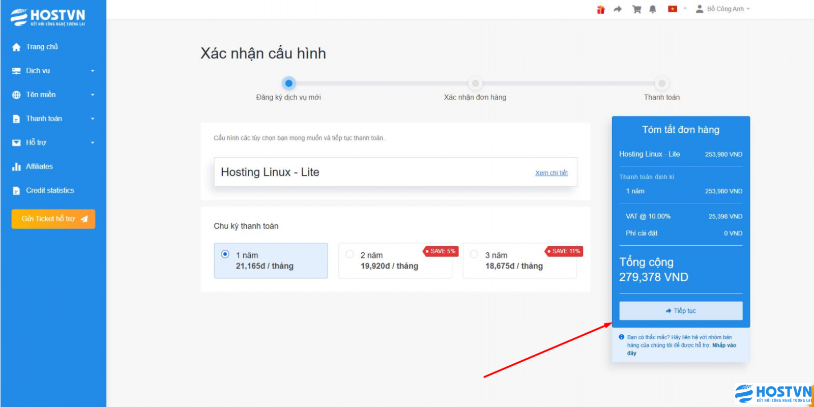 Bước 3: Chọn tên miền chính cho dịch vụ - Đăng ký tên miền mới: Nếu quý khách chưa có tên miền và muốn đăng ký một tên miền mới tại HOSTVN hãy chọn lựa chọn này - Chuyển tên miền về HOSTVN: Nếu có khách đã đăng ký tên miền ở nhà cung cấp khác và muốn chuyển tên miền về quản lý tại HOSTVN quý khách có thể chọn lựa chọn này. - Sử dụng tên miền có sẵn của tôi: Sử dụng lựa chọn này nếu quý khách muốn sử dụng một tên miền bất kỳ là tên miền chính trên hosting. Các bạn có thể đăng ký thời sử dụng hosting theo nhu cầu như 1 năm, 2 năm,... và sau đó chọn Tiếp tục. Bước 5: Xác nhận đơn hàng. Tại bước này quý khách vui lòng kiểm tra lại một lần nữa thông tin đơn hàng. Ngoài ra quý khách cũng có thể sử dụng mã giảm giá nếu có và chọn phương thức thanh toán. Sau đó quý khách click nút Thanh toán để tiến hành thanh toán.