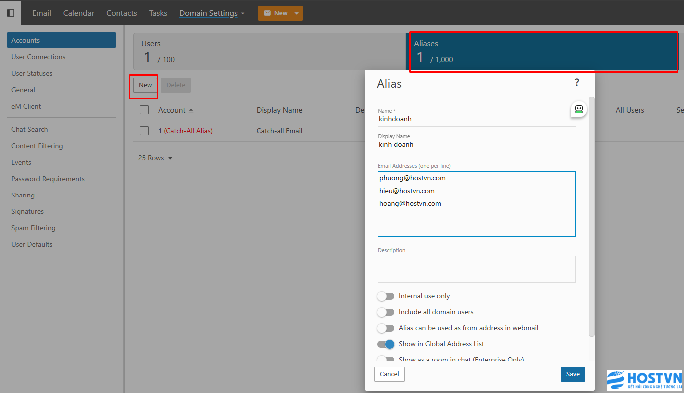 Sau khi cài đặt xong, bạn chỉ cần soạn email và gửi tới địa chỉ kinhdoanh@hostvn.com là tất cả các email trong danh sách nhập ở hình trên sẽ đều nhận được.
