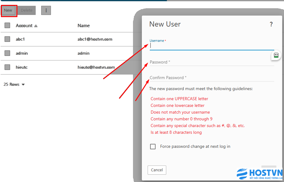 Bước 3 .Tại giao điện này bạn nhấn vào New để hiển thị giao diện tạo user -> Nhập các đầy đủ các trường Username, Password, Confirm Password -> Save để tạo tài khoản mới.