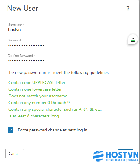 Nếu như bạn muốn đổi mật khẩu khi đăng nhập lần tới thì hãy tick “Force password change at next log in”.