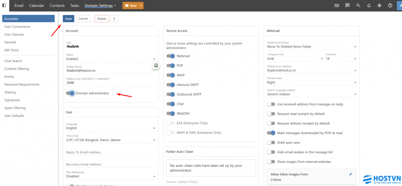 Tiếp theo, nhấn chọn Domain Settings. Tại đây, bạn sẽ thấy danh sách toàn bộ các tài khoản đang hoạt động trong hệ thống của mình.