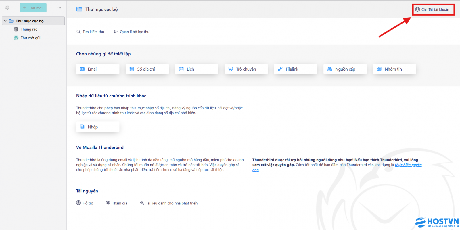 Tại bảng điều khiển chính của Thunderbird, bạn  chọn Cài đặt tài khoản (Account Settings).