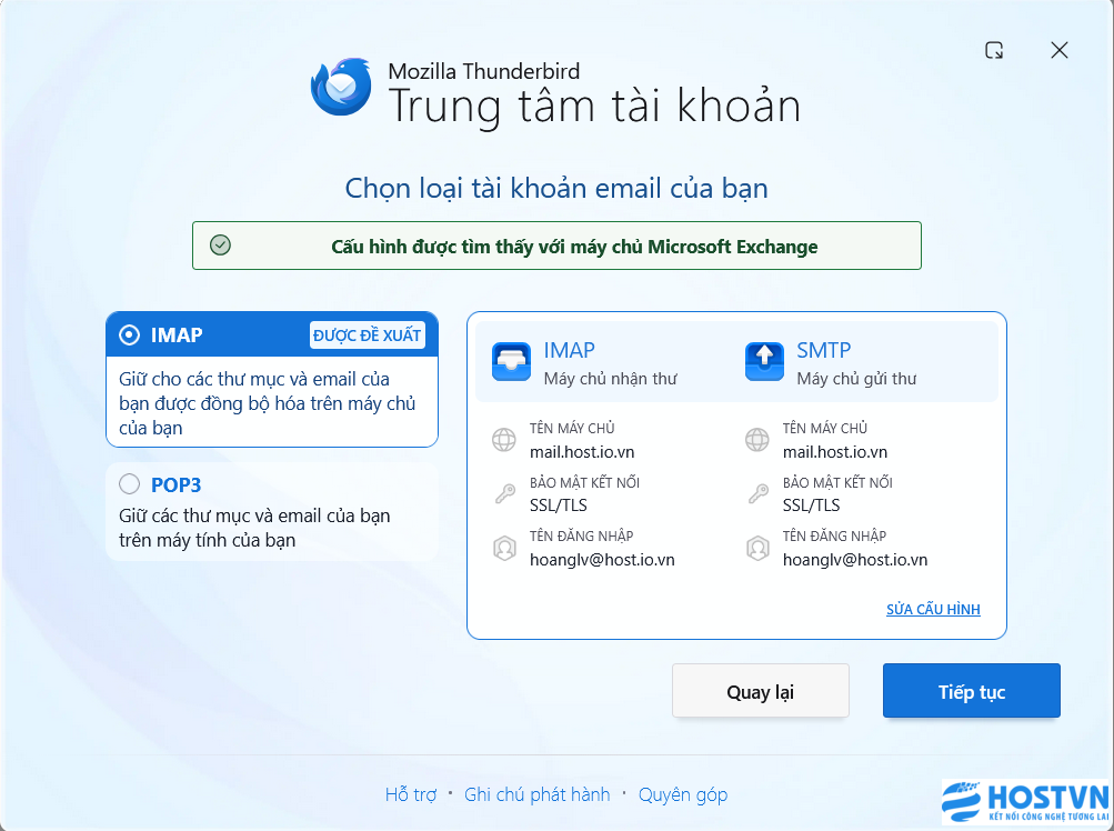 Thunderbird sẽ tự động thiết lập giúp bạn, tại đây bạn chọn IMAP và nhấn Tiếp tục.