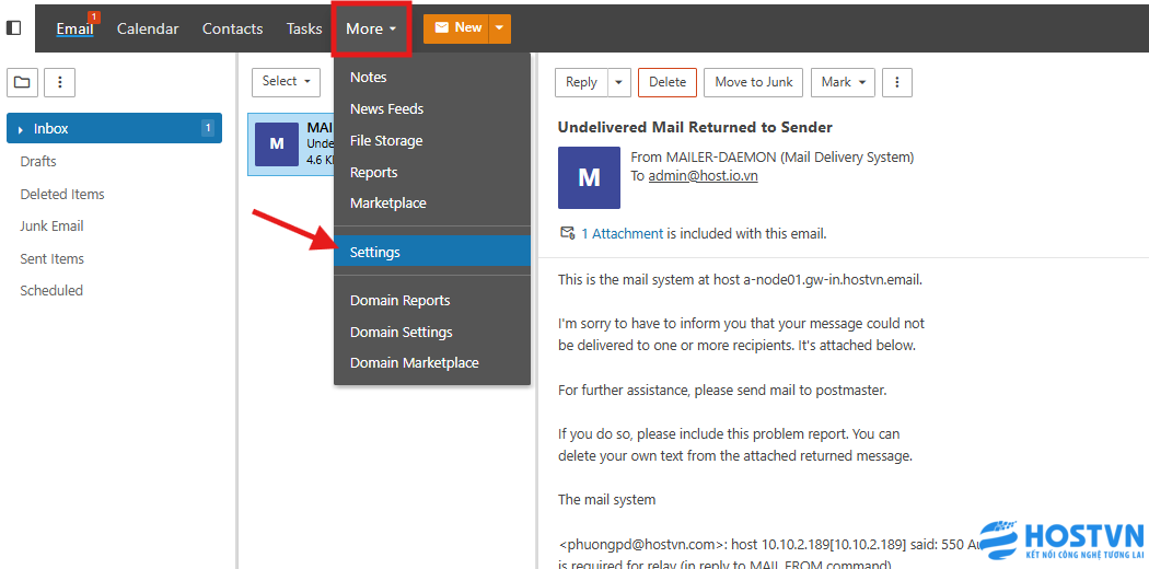 Truy cập vào webmail bằng tài khoản có quyền quản trị cao nhất, tìm đến More và chọn Settings.