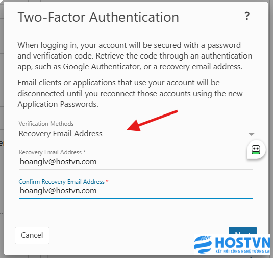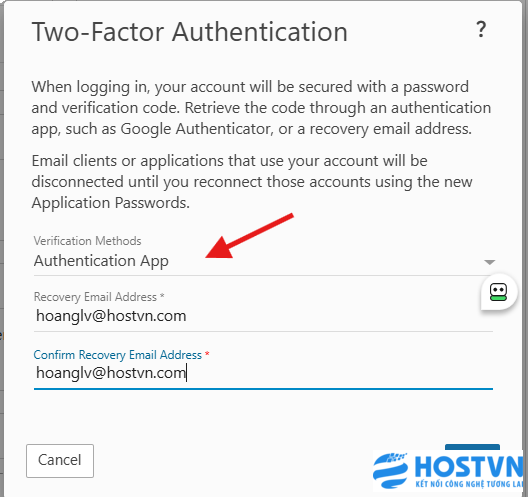 - Sau khi chọn vào Enable, tại cửa sổ Tow-Factor Authentiaction mở ra, bạn có thể chọn vào Recovery Email Address và điền thông tin Email sẽ nhận mã xác thực cho tài khoản Email Business của bạn.