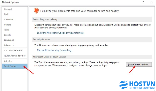 • Tại Outlook Options mở ra, bạn tìm đến Trust Center, sau đó chọn tiếp vào Trust Center Settings....