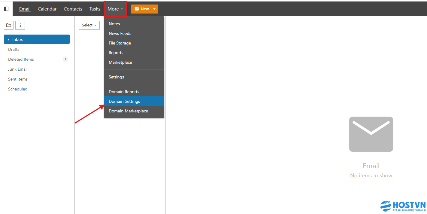 Đầu tiên, bạn truy cập vào webmail và chọn đến More sau đó chọn Domain Settings.