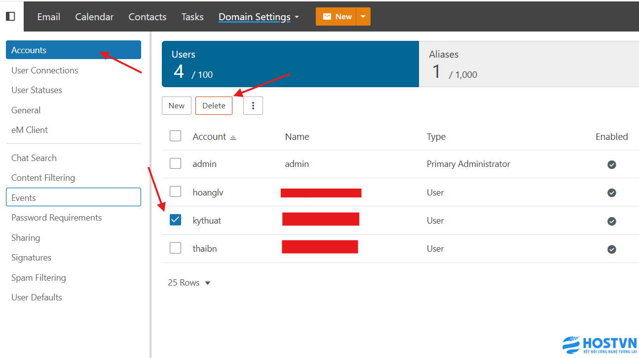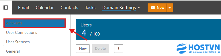 Để thao tác xóa tài khoản, bạn đăng nhập vào webmail của bạn với đường dẫn mail.domain.com hoặc webmail.domain.com (mặc định khi đăng ký tại HOSTVN), và truy cập vào bằng tài khoản có quyền quản trị cao nhất.